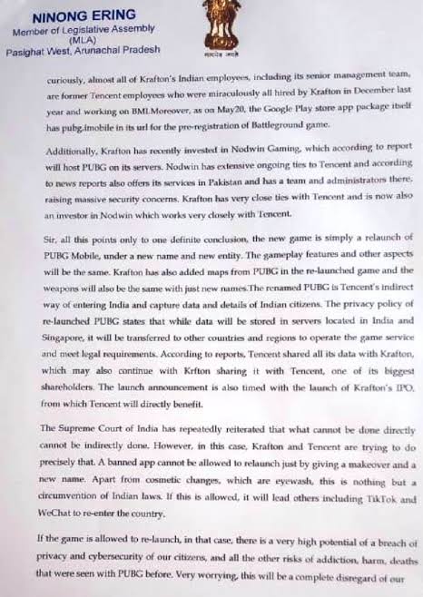 Requested @PMOIndia @narendramodi ji to not allow Chinese deception #BattlegroundsMobileIndia. It is a big threat to security of India & privacy of our citizens and a way to circumvent & disregard our laws.@AmitShah #IndiaBanBattlegrounds #NationFirst #AatmaNirbharBharat @ANI pic.twitter.com/H8nzUJ4aRk — Ninong Ering (@ninong_erring) May 22, 2021